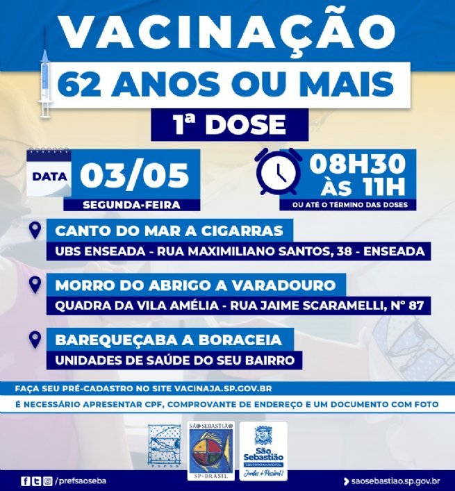 Vacinação contra Covid-19 para pessoas a partir de 62 anos tem início nesta segunda-feira (03)